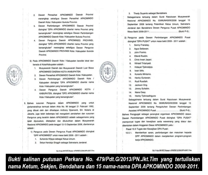 Keputusan tersebut kemudian berujung pada gugatan hukum pada 2013 melalui perkara Nomor 479/PDT.G/2013/PN.JKT.TIM di Pengadilan Negeri Jakarta Timur. Dalam putusan tersebut juga tercatat pembentukan Caretaker DPP APKOMINDO oleh DPA melalui Surat Keputusan Nomor 06/SK-DPA/10/2011 tertanggal 22 Oktober 2011.