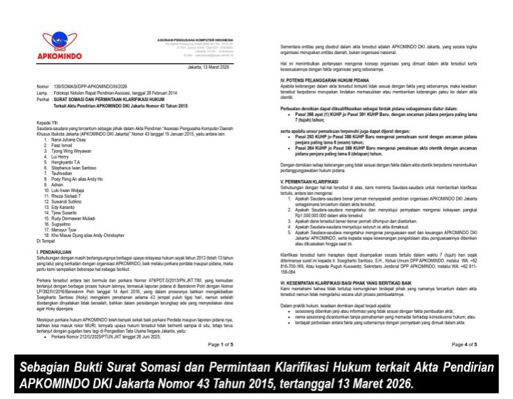 Di tengah proses hukum yang masih berjalan, Hoky mengungkap adanya dugaan rekayasa hukum yang berlangsung secara sistematis. Hal ini mendorong pihaknya melakukan penelusuran terhadap sejumlah dokumen, termasuk Akta Pendirian APKOMINDO DKI Jakarta Nomor 43 tanggal 15 Januari 2015.