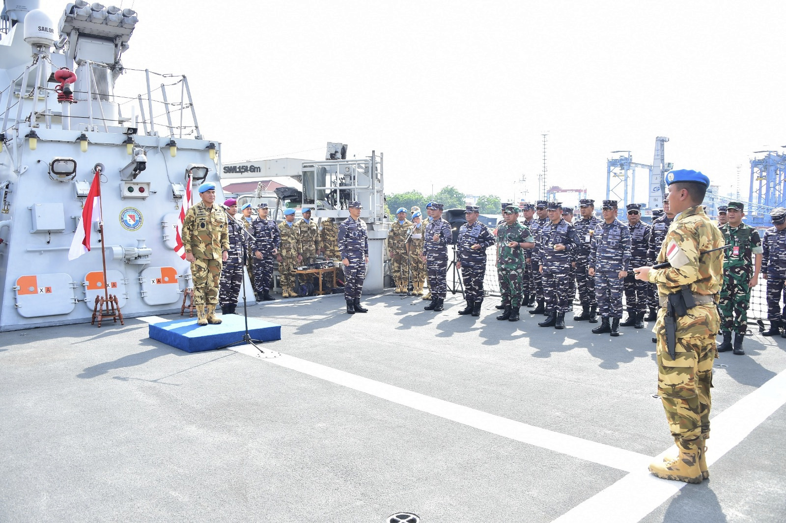 TNI AL-Dispenlantamal3. Komandan Pangkalan Utama TNI Angkatan Laut (Danlantamal) III Jakarta Brigjen TNI (Mar) Harry Indarto, S.E., M.M. menghadiri upacara pemberangkatan Satuan Tugas Maritime Task Force (Satgas MTF) TNI Kontingen Garuda (Konga) XXVIII-P/United Nations Interim Force in Lebanon (UNIFIL) TA 2024 dengan KRI Sultan Iskandar Muda (SIM)-367 dipimpin oleh Kepala Staf Angkatan Laut (Kasal) Laksamana TNI Dr. Muhammad Ali, S.E., M.M., M.Tr.Opsla. dihadiri Wakasal Laksdya TNI Erwin S. Aldedharma, S.E., M.M., M.Sc. bertempat di lapangan M. Silam Mako Kolinlamil, Jakarta Utara, Kamis (19/12/2024).