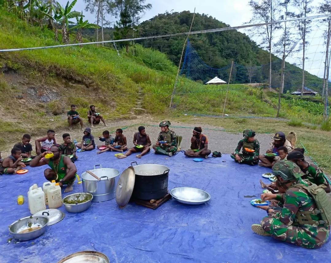 Makan siang sederhana ini menjadi bukti nyata Satgas Yonif 323 Kostrad tak hanya menjaga keamanan, tetapi juga membangun solidaritas dengan masyarakat setempat. (Penkostrad).