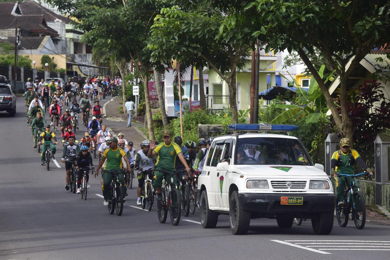 Jakarta. Yonarmed 11 Kostrad menggelar sepeda gembira (fun bike) dan senam bersama yang diikuti ribuan penggemar sepeda santai dari berbagai kalangan, guna memeriahkan Hari Ulang Tahun (HUT) Tentara Nasional Indonesia (TNI) ke 77 tahun 2022, yang bertempat di Depan Mako Yonarmed 11 Kostrad, Kelurahan Gelangan, Kecamatan Magelang Tengah, Kota Magelang, Minggu (16/10/2022).