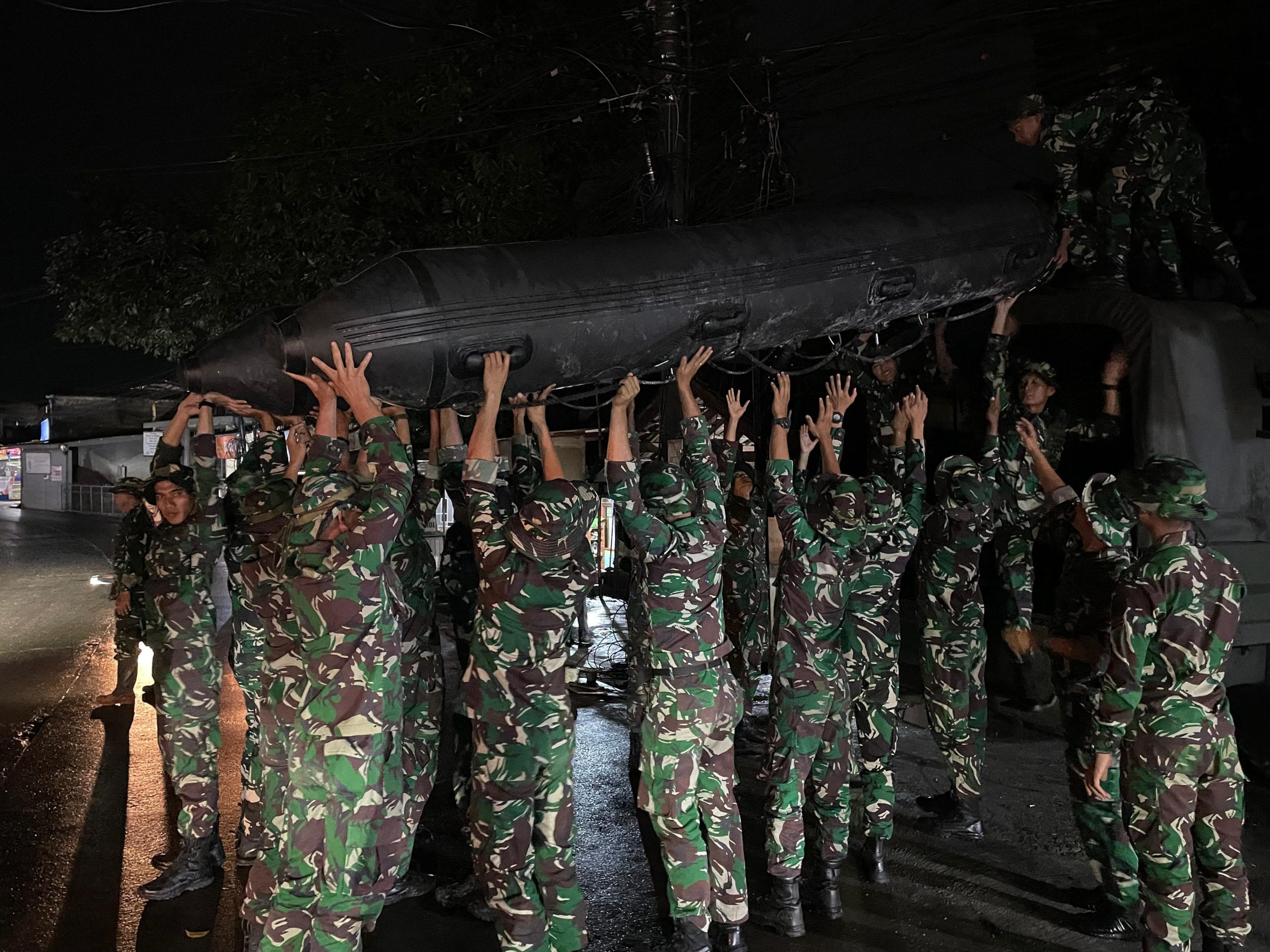 Dibawah derasnya guyuran hujan yang membasahi bumi, para Ksatria Tri Dharma bersama Petugas gabungan dari TNI/Polri, BPBD, PMI, serta relawan yang ada di lokasi bahu membahu melakukan proses evakuasi dan membantu warga yang terdampak banjir.