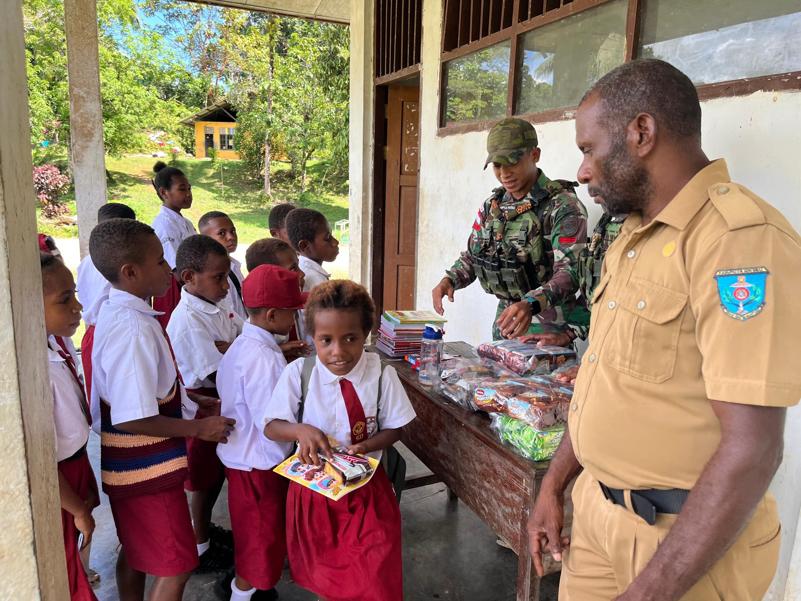 Dengan tetap mengutamakan keamanan selama kegiatan, interaksi komunikasi yang harmonis antara para Prajurit TNI dengan para warga semakin terjalin dengan inisiatif pembagian alat-alat tulis dan kue kepada para siswa. Kegembiraan anak-anak langsung terlihat dari senyum dan tawa lebar sesaat setelah menerima pemberian cuma-cuma para Prajurit TNI termasuk Andre Fatemyo, yang menyampaikan terima kasih atas kepedulian Prajurit TNI.