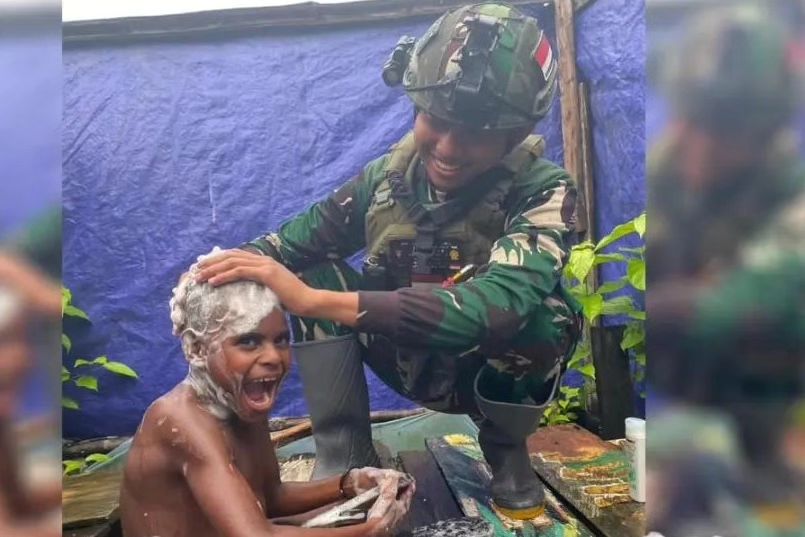 MetropolitanPost.id – Satgas Pamtas Mobile RI-PNG Yonif 503 Kostrad Koops Habema mengajarkan anak – anak di daerah operasi untuk menjaga kebersihan dengan Mandi air bersih di Pos Batas Batu, Kecamatan Batas Batu Kabupaten Nduga, Papua. Kamis (04/07/2024).