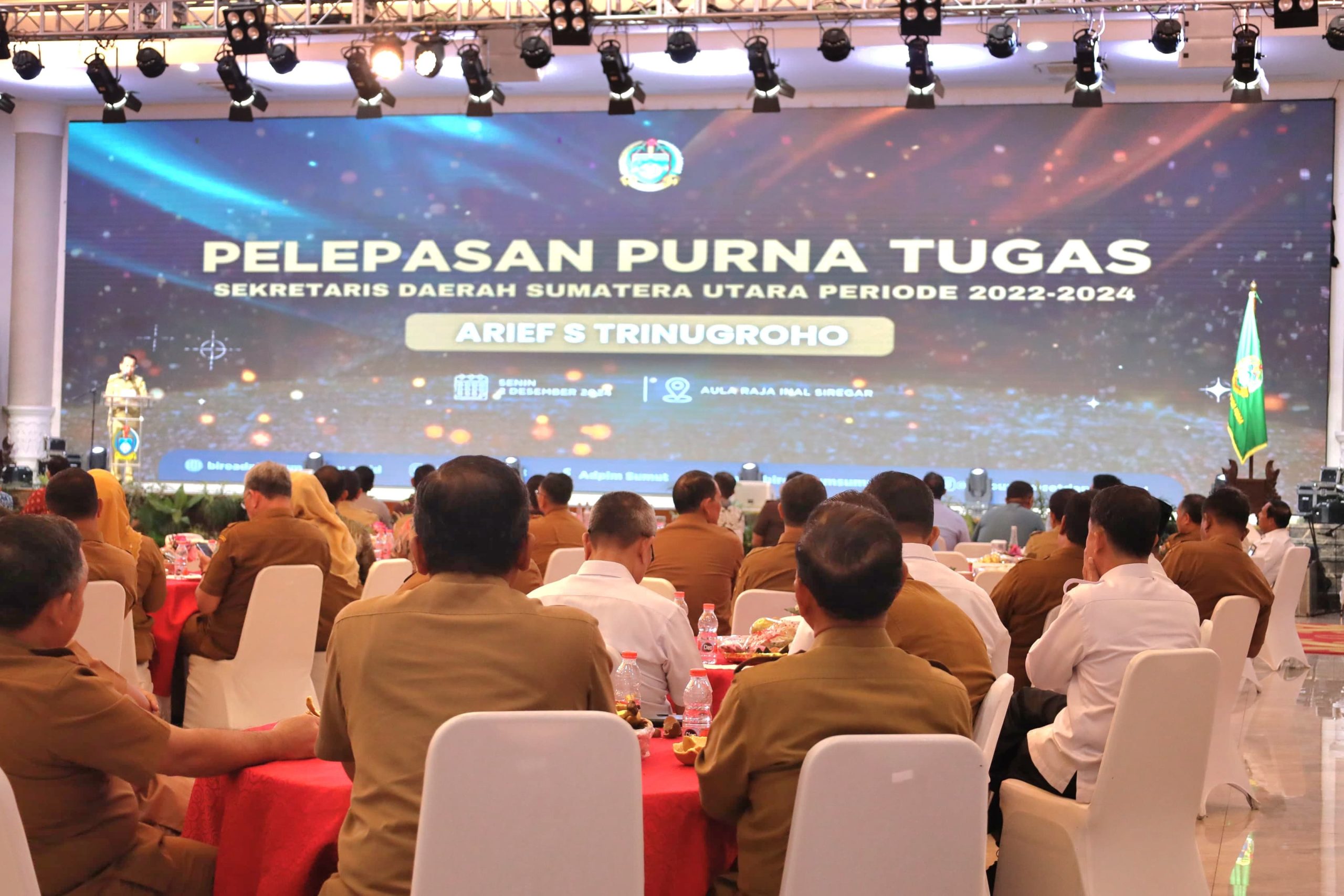 Pj. Gubernur Sumatera Utara Dr. Drs. Agus Fatoni menyampaikan selamat memasuki purna tugas kepada Arief S. Trinugroho sebagai Sekda Provinsi Sumut periode 2022-2024. Terima kasih atas pengabdian selama ini di Provinsi Sumatera Utara. Bapak selalu melaksanakan tugas pengabdian dengan penuh dedikasi dan tanggung jawab. Ini suatu sikap yang harus diteladani oleh seluruh aparatur pemerintahan khususnya di lingkungan Provinsi Sumatera Utara.