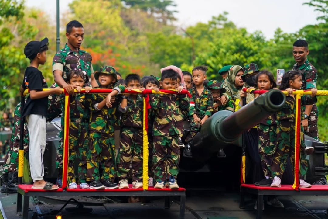 Siswa-siswi TK Kartika XI 24 Yonkav 8 Kostrad sedang menikmati asyiknya naik kendaraan tempur Tank Leopard 2A4 yang mampu memberikan canda dan tawa. Kegiatan tersebut bertujuan untuk menanamkan jiwa patriotisme dan nasionalisme kepada anak-anak sejak usia dini.