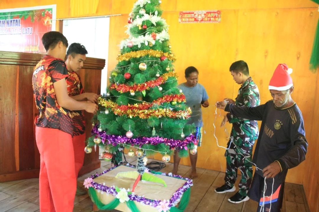Personil Satgas dari Pasukan Pandawa Kostrad bersama masyarakat Batas Batu begitu semangat dan kompak mempersiapkan sarana ibadah untuk perayaan Natal tahun 2023.
