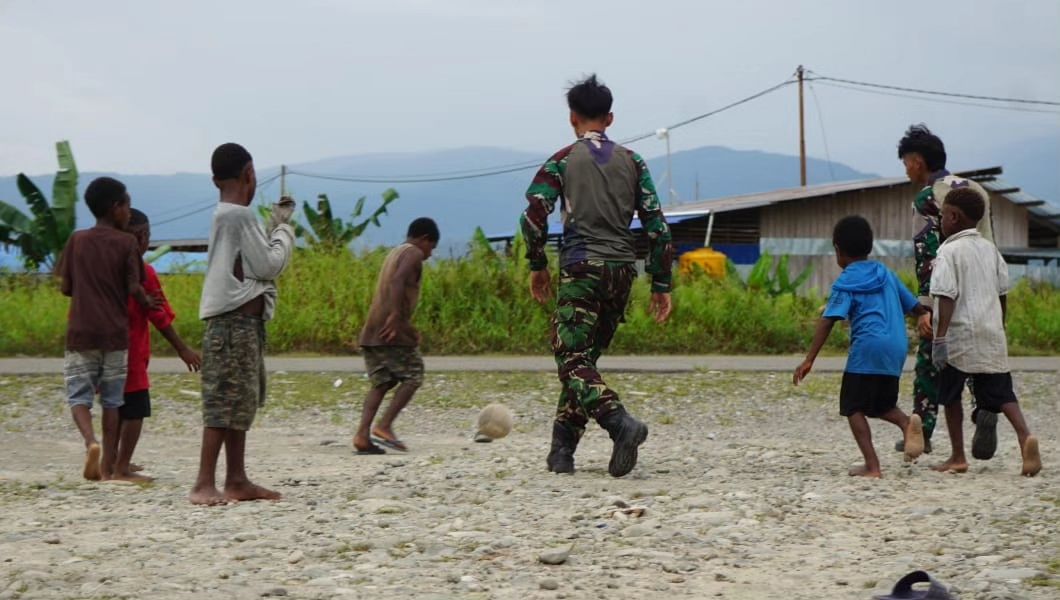 MetropolitanPost.id – Ada saja cara Pasukan Pandawa Kostrad menjalin keakraban dengan anak-anak Keneyam, kali ini mereka bermain sepakbola bersama di depan Pos Kotis, Distrik Keneyam, Kabupaten Nduga, Provinsi Papua Pegunungan. Kamis (7/12/2023).