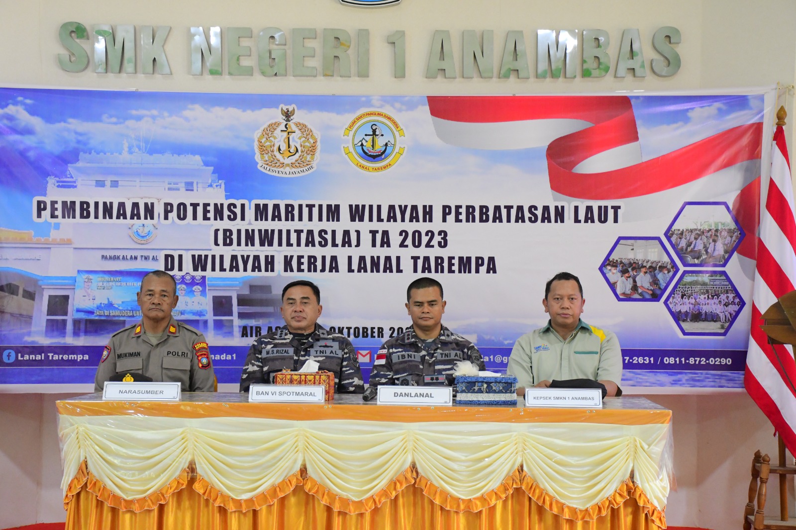 Program yang berlangsung selama 2 (dua) hari ini dibuka oleh Paban VI Spotmaral Kolonel Laut (P) M. Syamsul Rizal mewakili Asisten Potensi Maritim (Aspotmar) Kasal, bertempat di SMAN 1 Anambas, Desa Air Asuk, Kecamatan Siantan Tengah, Kabupaten Kepulauan Anambas, Selasa (24/10/2023).