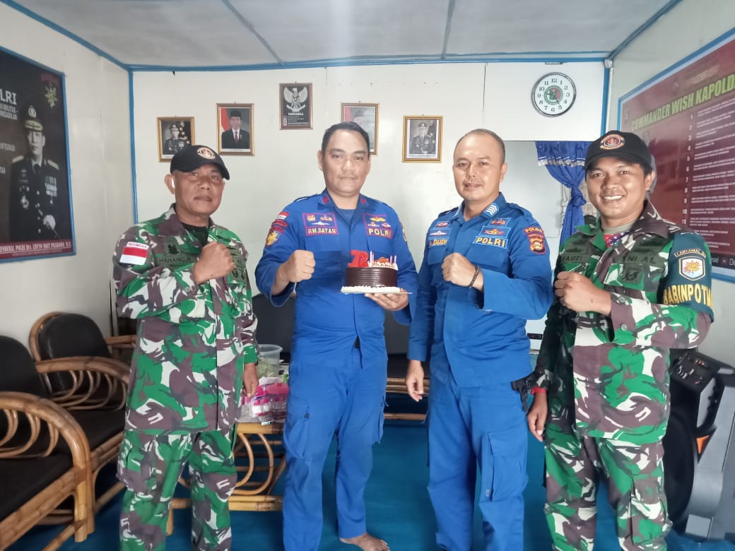 MetropolitanPost.id — Anggota Babinpotmar Desa Sungsang IV Kecamatan Banyuasin II Kabupaten Banyuasin Serda TTU Hanang Riyadi dan Kopda Rdl Fauzi Setiawan mendatangi Pangkalan Sandar Pos Polairud Sungsang dan memberikan surprise dengan membawa kue tart sebagai ucapan dalam rangka memperingati HUT Ke-72 Polairud.