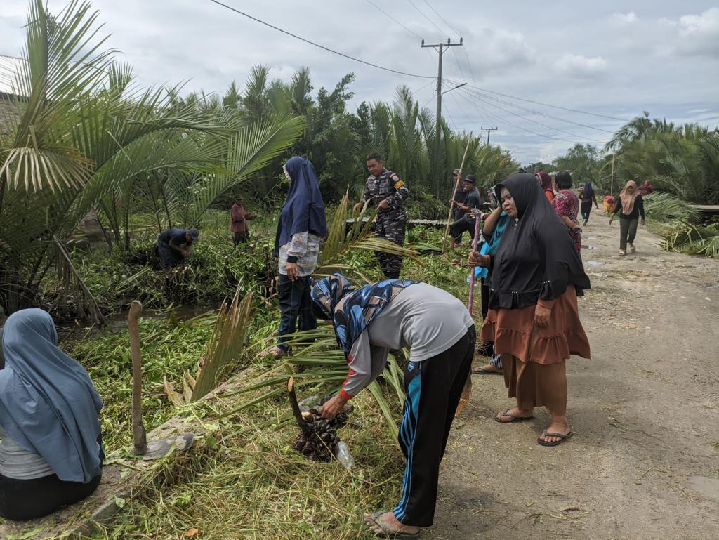 Babinpotmar Posal Tanjung Tiram Lanal TBA Koptu Mawardi bersama warga gotong royong membersihkan aliran air atau parit di Dusun 2 dan 3 Desa Guntung, Kecamatan Tanjung Tiram, Kabupaten Batu Bara, Minggu (30/10/2022).