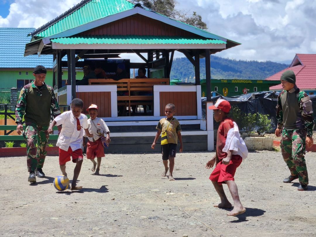 MetropolitanPost.id – Di suatu siang, tatkala sinar mentari begitu terik menyinari bumi Sugapa. Nampak sejumlah anak yang baru pulang dari sekolah sedang asyik bermain bola dengan para prajurit Satgas Yonif 330 Kostrad di halaman pos Mamba, Kab. Intan Jaya, Prov. Papua Tengah. Selasa (21/11/2023).