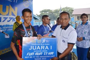 “Pada kesempatan ini, saya selaku Komandan Lanal Dumai beserta staf menyampaikan ucapan terima kasih yang sebesar-besarnya kepada seluruh peserta Fun Run yang telah ikut berpartisipasi memeriahkan kegiatan ini dan memberikan apresiasi kepada pelari tercepat pertama sampai ketiga dengan kategori umum, kategori putri dan kategori pelajar serta hadiah doorprize,” pungkasnya.