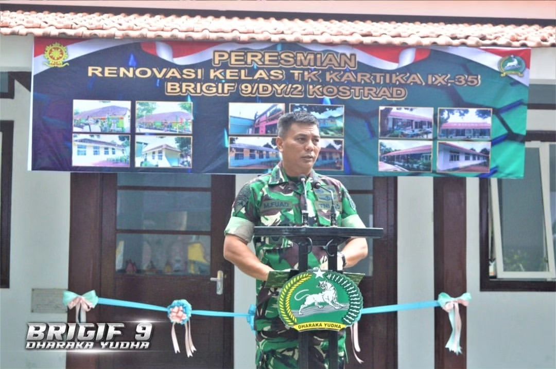 Dalam sambutannya Danbrigif 9 Kostrad, Kolonel Inf M. Fuad Suparlin, S.I.P., M.Tr(Han) Pertama-tama Saya menyampaikan apresiasi setinggi tingginya kepada semua pihak atas inisiasi dan kotribusinya dalam pelaksanaan kegiatan pembangunan TK Kartika IX-35 untuk bisa di manfaatkan Semua fasilitas yang sudah tersedia ini.