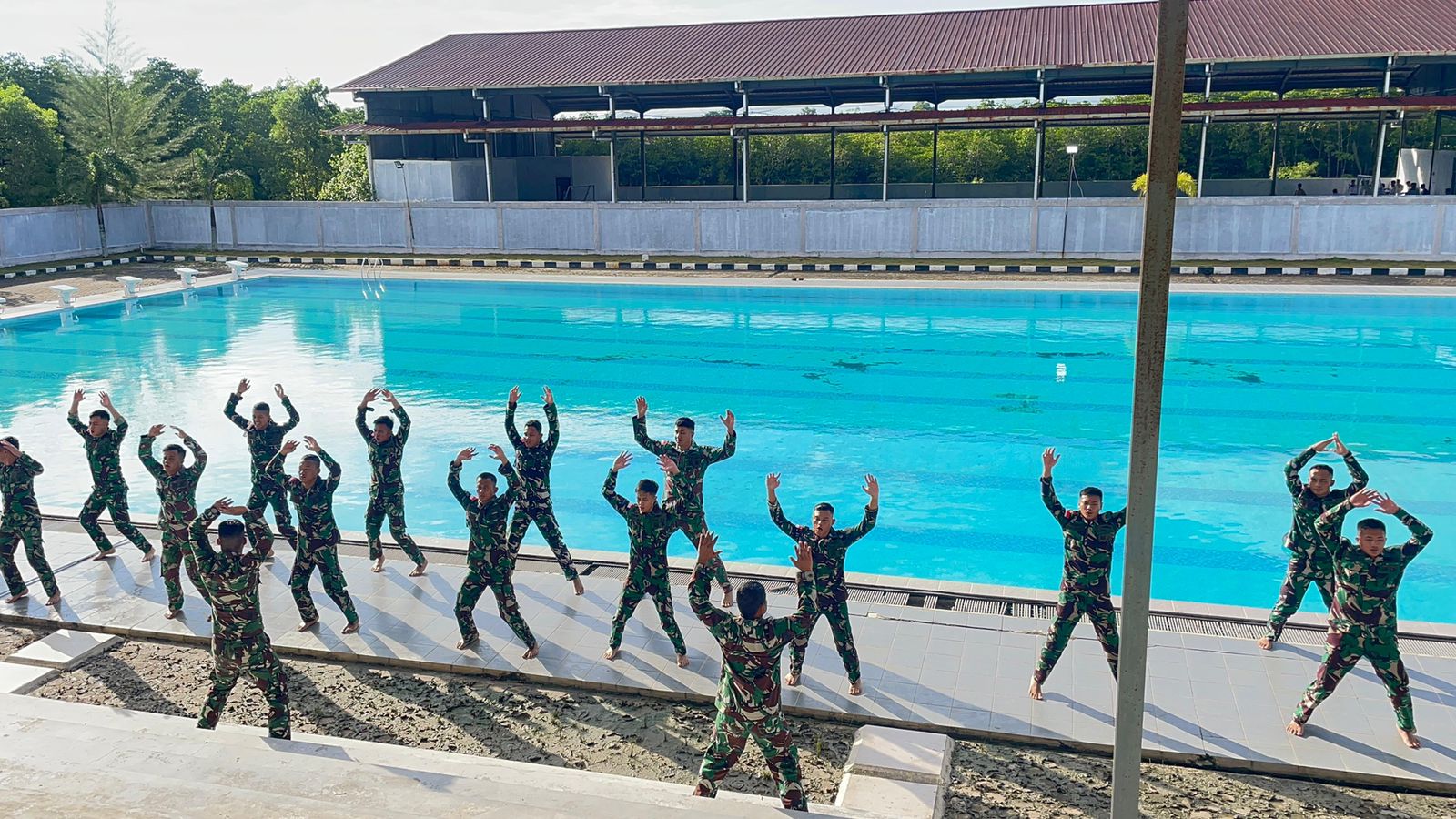Sebelum renang dimulai, kegiatan diawali dengan senam pemanasan yang dilaksanakan untuk meminimalisir cidera saat berenang. Pelaksanaan renang militer kali ini mengambil jarak 50 meter dan dilaksanakan menggunakan perlengkapan perorangan meliputi Pakaian Dinas Lapangan (PDL), senjata organik dan helm tempur.