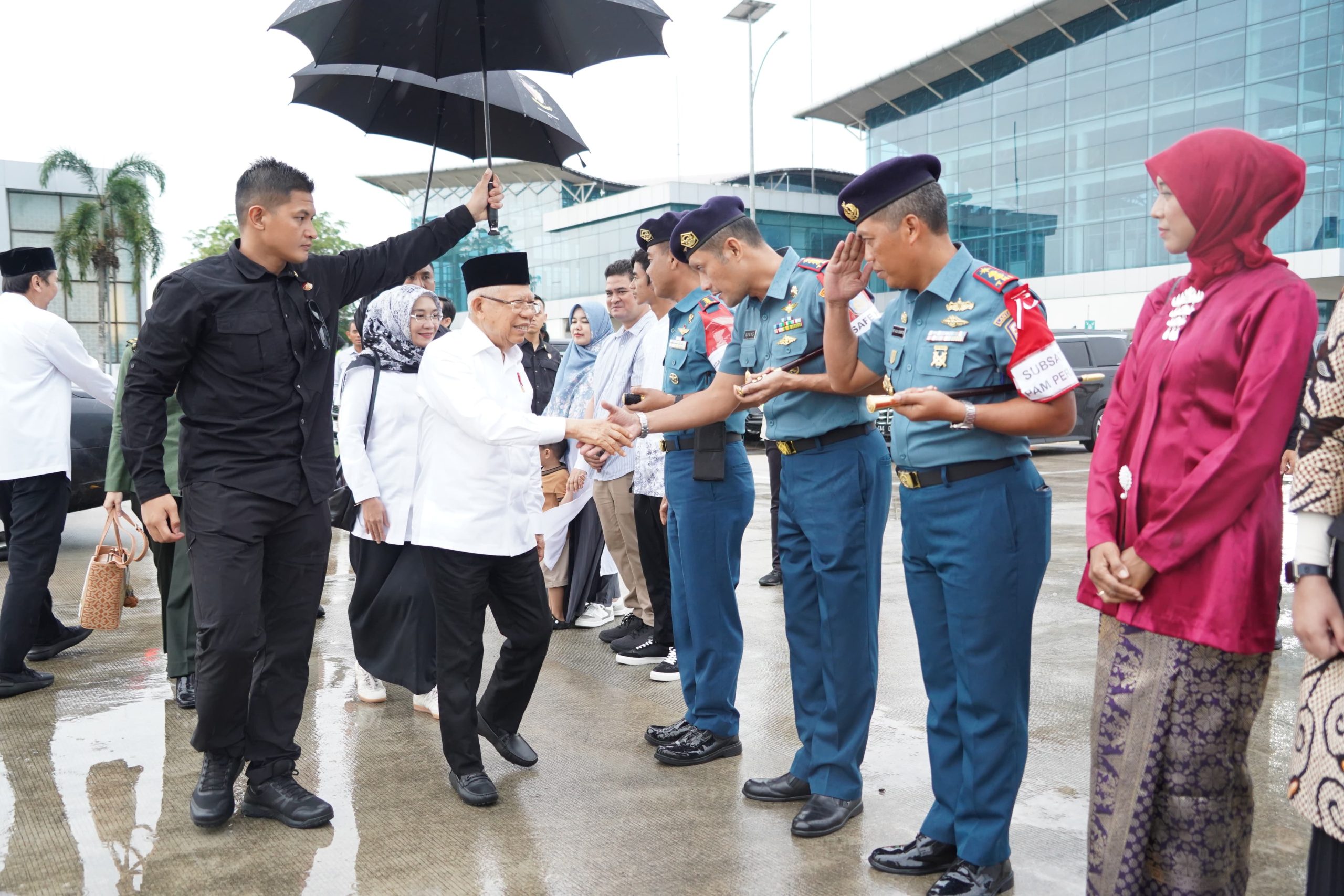 Kedatangan Wakil Presiden RI beserta rombingan disambut oleh Gubernur Kepri Ansar Ahmad, S.E., M.M. beserta Istri, Kapolda Kepri Irjen Pol Drs. Yan Fitri H, Kabinda Kepri Brigjen TNI Bonar Panjaitan, S.E., M.Si., Danrem 033/WP Brigjen TNI Jimmy Watuseke, KS. Koarmada I, Danguspurla Koarmada I Laksamana Pertama TNI Mohammad Taufik, M.MDS., Danlanud RHF Kolonel Pnb Andi Nur Abadi, Danlanudal Tanjungpinang Kolonel Laut (P) Sahid Hamdani, S.H., Danwing Udara I Kolonel Laut (P) Gugus Wahyu, S.U., S.H., M.Tr. Hanla., M.M., Danlanal Bintan Letkol Laut (P) Eko Agus Susanto, S.E., M.M., Bakamla Kazona Barat Kolonel Bakamla Tuyatman, S.H.,M.H., Ketua Pengadilan Tinggi Agama Provinsi Kepri diwakili Wakili Ketua Dr. Drs. H. Dalih Effendy, S.H., M.Esy, Kajati Kepri Teguh Subroto, Kepala Dinkes Provinsi Kepri M. Bisri, Kepala Dishub Provinsi Kepri Junaidi, Kepala Satpol-PP Provinsi Kepri Hendri Kurniadi, S.STP.