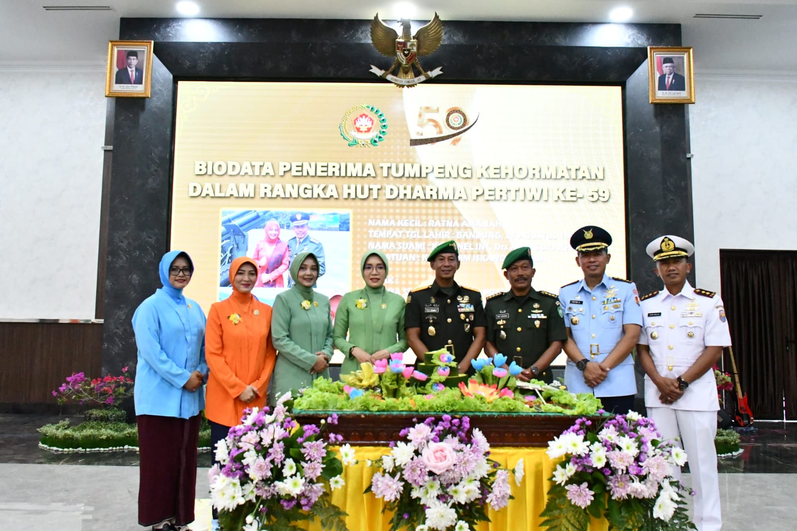 Dalam sambutannya, Ketua Dharma Pertiwi Daerah R Ny. Iin Novi Helmi Prasetya menyampaikan “59 tahun bukanlah waktu yang pendek, perjalanan panjang pengabdian Dharma Pertiwi sebagai organisasi ekstra struktural sosial turut berkiprah dan mengambil bagian dalam upaya membangun bangsa melalui peningkatan kepedulian sosial pendidikan dan kesejahteraan prajurit TNI beserta keluarga besarnya.”