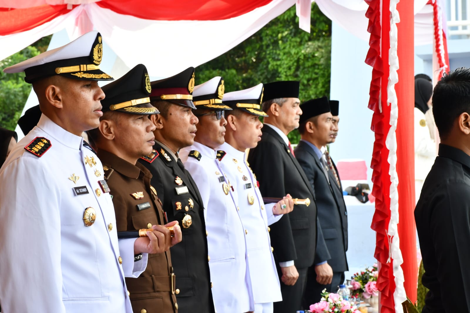 PJ. Walikota Sabang Drs. Reza Fahlevi, M.Si., Ketua DPRK Sabang M. Nasir, Komandan Lanal Sabang Kolonel Laut (P) Ali Setiandy, M.Tr (Han)., M.M. Kafasharkan Sabang Kolonel Laut (T) Teguh Sukrisno, S.T., M.M., Danlanud Maimus Saleh Letkol Pnb Fahrul Rozi, S.T., M.I.Pol., Dandim 0112/Sabang Letkol Inf Ahmad Sobirin, Kapolres Sabang diwakili Kabag Ops AKP Abdul Hamid, S.H., Danlanudal Sabang Mayor Laut (P) Nasrulloh, M.Tr. Opsla., Dansatrad 233 Sabang Mayor Lek I Made Sukrawan, S.T., M.T., Kepala BPKS diwakili T. Zanuarsyah, Kadispora Sabang Irfani, S.Sos., Ketua KNPI Sabang Ferdiansyah, S.Kel., Kepala Kajari Sabang diwakili Kasi Intel Jen Tanamal, S.H., Kepala Kaban Kesbangpol Sabang T. Ramli Angkasa, Para Asisten Pemko Sabang,