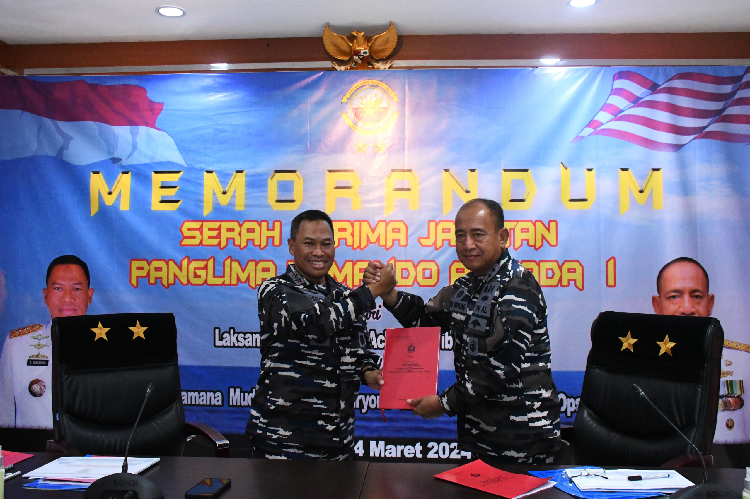 MetropolitanPost.id – Komandan Pangkalan Utama TNI Angkatan Laut I (Danlantamal I) Brigjen TNI (Mar) Jasiman Purba, S.E., CHRMP., menghadiri acara Admiral Inspection dan Pembacaan Memorandum Serah Terima Jabatan (Sertijab) Panglima Komando Armada (Pangkoarmada) I dari Laksda TNI Achmad Wibisono, S.E., CHMRP., kepada Laksda TNI Yoos Suryono Hadi, M.Tr.(Han)., M.Tr.Opsla., CHRMP., bertempat di ruang TFG Satkor Koarmada I Kesatrian Pondok Dayung, Jakarta Utara, Minggu (24/3/2024).
