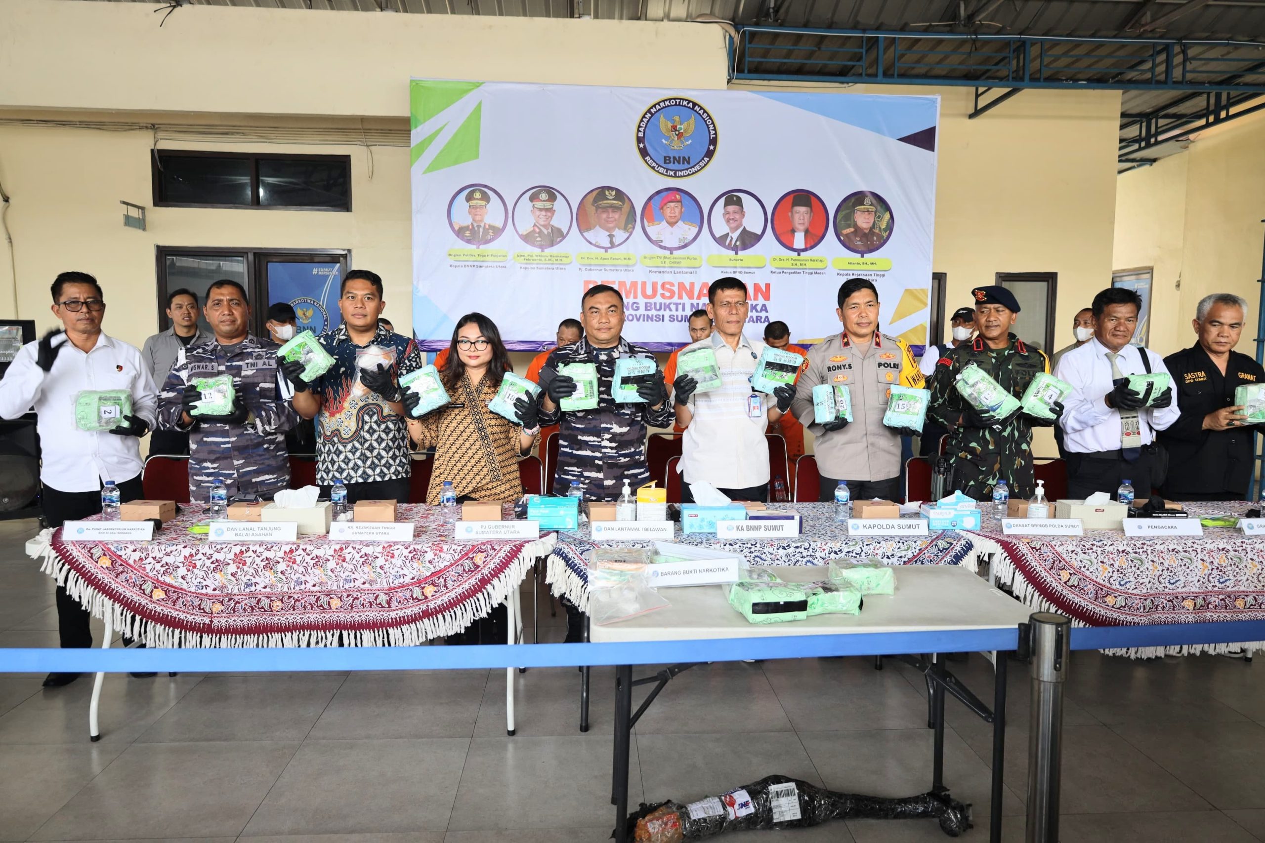 Barang bukti yang dimusnahkan adalah jenis sabu seberat 21.497,6636 Gram. Kepala BNN Provinsi Sumut dalam penjelasannya mengatakan, barang bukti tersebut diantaranya hasil tangkapan Lanal Tanjung Balai Asahan, penangkapan ini berhasil menyelamatkan anak bangsa dari peredaran narkotika sebanyak 172.865 orang.