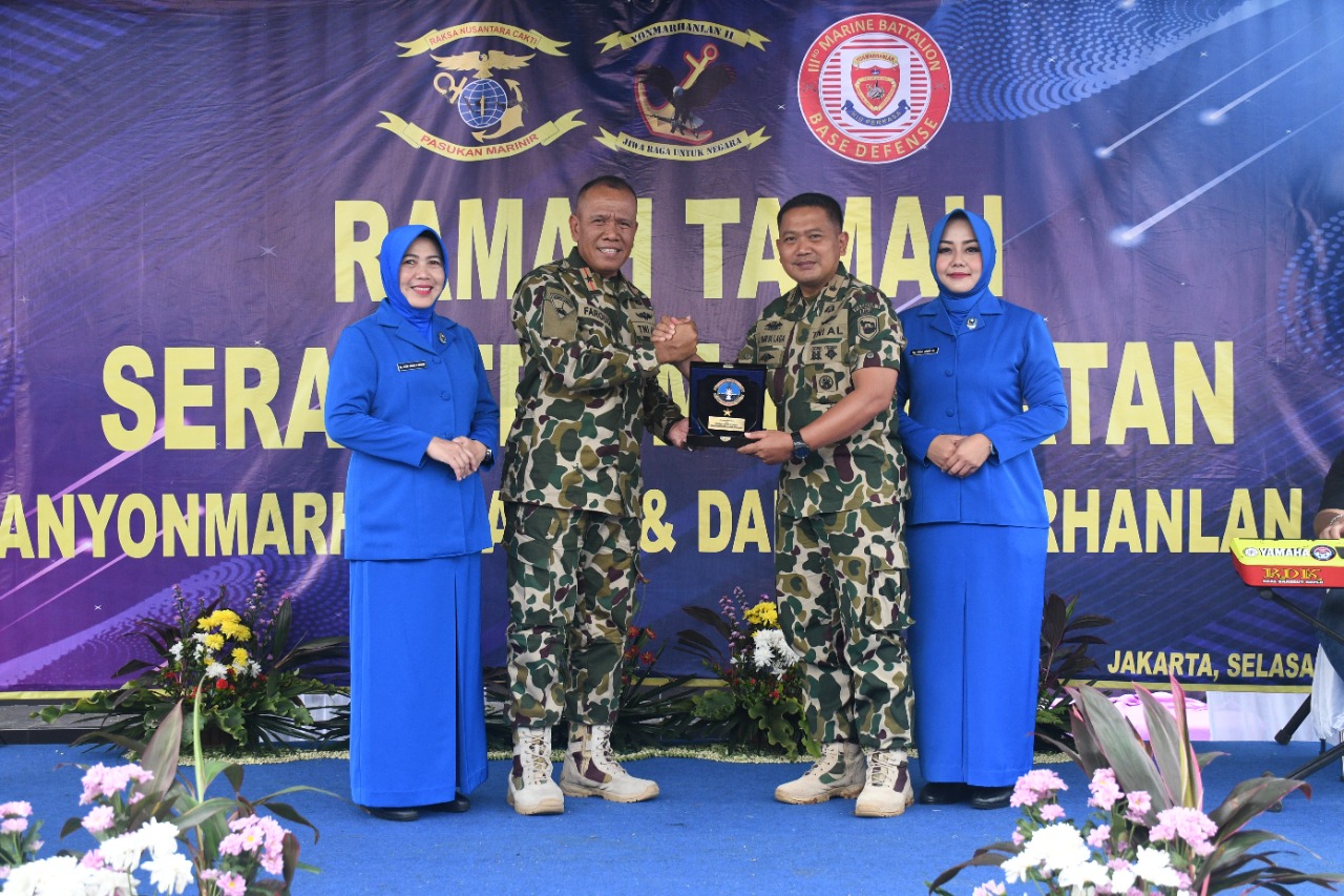 Komandan Lantama III Jakarta Brigjen TNI (Mar) Umar Farouq, S.A.P., CHRMP., M,Tr.opsla., M. Han menghadiri serah terima jabatan Komandan Batalyon Marinir Pertahanan Pangkalan (Danyonmarhanlan) II Padang dan Komandan Batalyon Marinir Pertahanan Pangkalan (Danyonmarhanlan) III Jakarta yang dipimpin Komandan Pasmar I Brigjen TNI Hermanto, S.E., M.M. di Mako Yonmarhanlan III Komplek Kodamar Jakarta Utara, Selasa(18/10/2022).