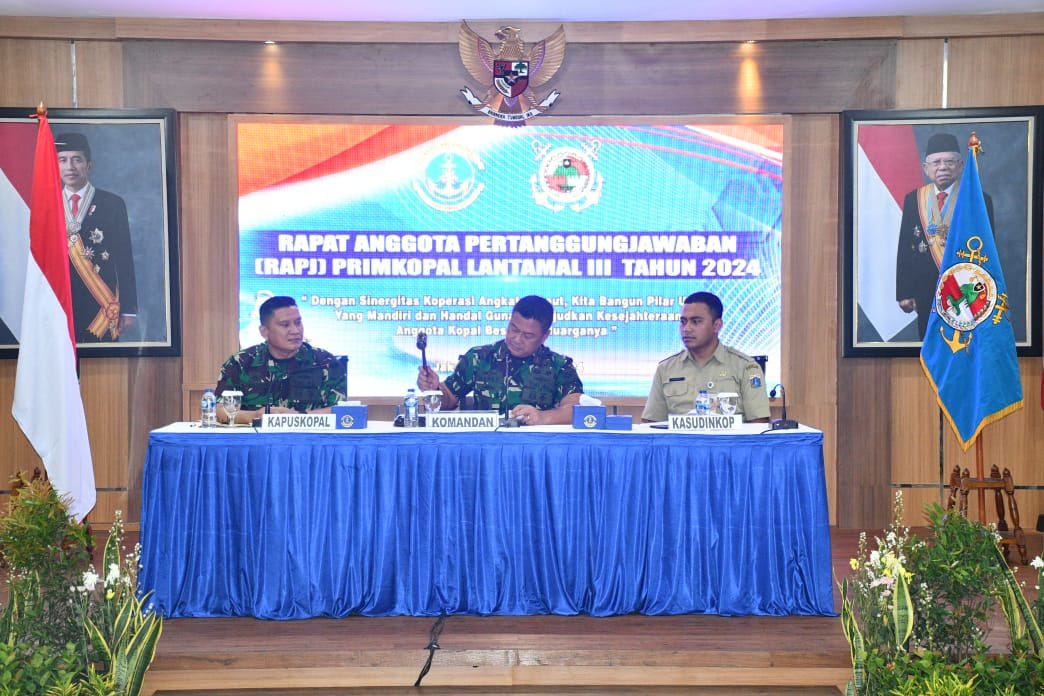 MetropolitanPost.id – Komandan Pangkalan Utama TNI Angkatan Laut (Danlantamal) III Jakarta Brigjen TNI (Mar) Harry Indarto, S.E., M.M. selaku Pembina Primer Koperasi TNI Angkatan Laut (Primkopal) Lantamal III Jakarta membuka Rapat Anggota Pertanggungjawaban (RAPJ) Primkopal Lantamal III Jakarta tahun buku 2023 bertempat di gedung serbaguna (GSG) Mako Lantamal III Jakarta Jl. Gunung Sahari No. 2 Ancol, Jakarta Utara, Senin (19/02/2024).