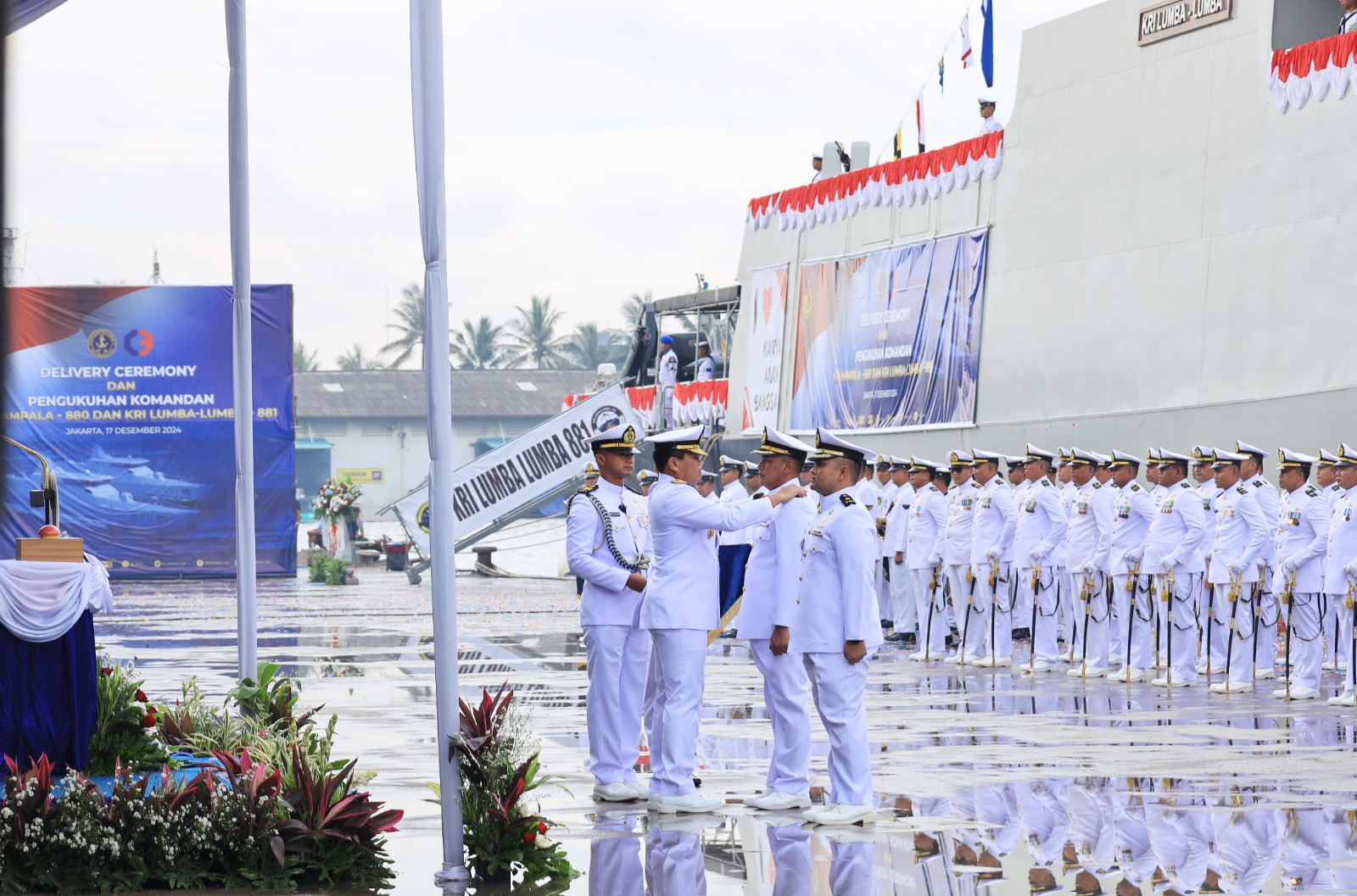 TNI AL-Dispenlantamal3. Komandan Pangkalan Utama TNI Angkatan Laut (Danlantamal) III Jakarta Brigjen TNI (Mar) Harry Indarto, S.E., M.M. dan Ketua Koordinator Cabang (Korcab) III Daerah Jalasenastri Armada (DJA) I Ny. Neneng Harry Indarto menghadiri acara serah terima, peresmian, dan pengukuhan Komandan KRI Hampala-880 KRI Lumba-Lumba-881 dipimpin oleh Kepala Staf Angkatan Laut (Kasal) Laksamana TNI Dr. Muhammad Ali, S.E., M.M., M.Tr.Opsla. dihadiri Wakasal Laksdya TNI Erwin S. Aldedharma, S.E., M.M., M.Sc., Ketua Umum Jalasenastri Ny. Fera Muhammad Ali, dan Waketum Jalasenastri Ny. Ketty Erwin S. Aldedharma bertempat di Batavia Sunda Kelapa Marina Jl. Raya Baruna No. 9, Jakarta, Selasa (17/12/2024).