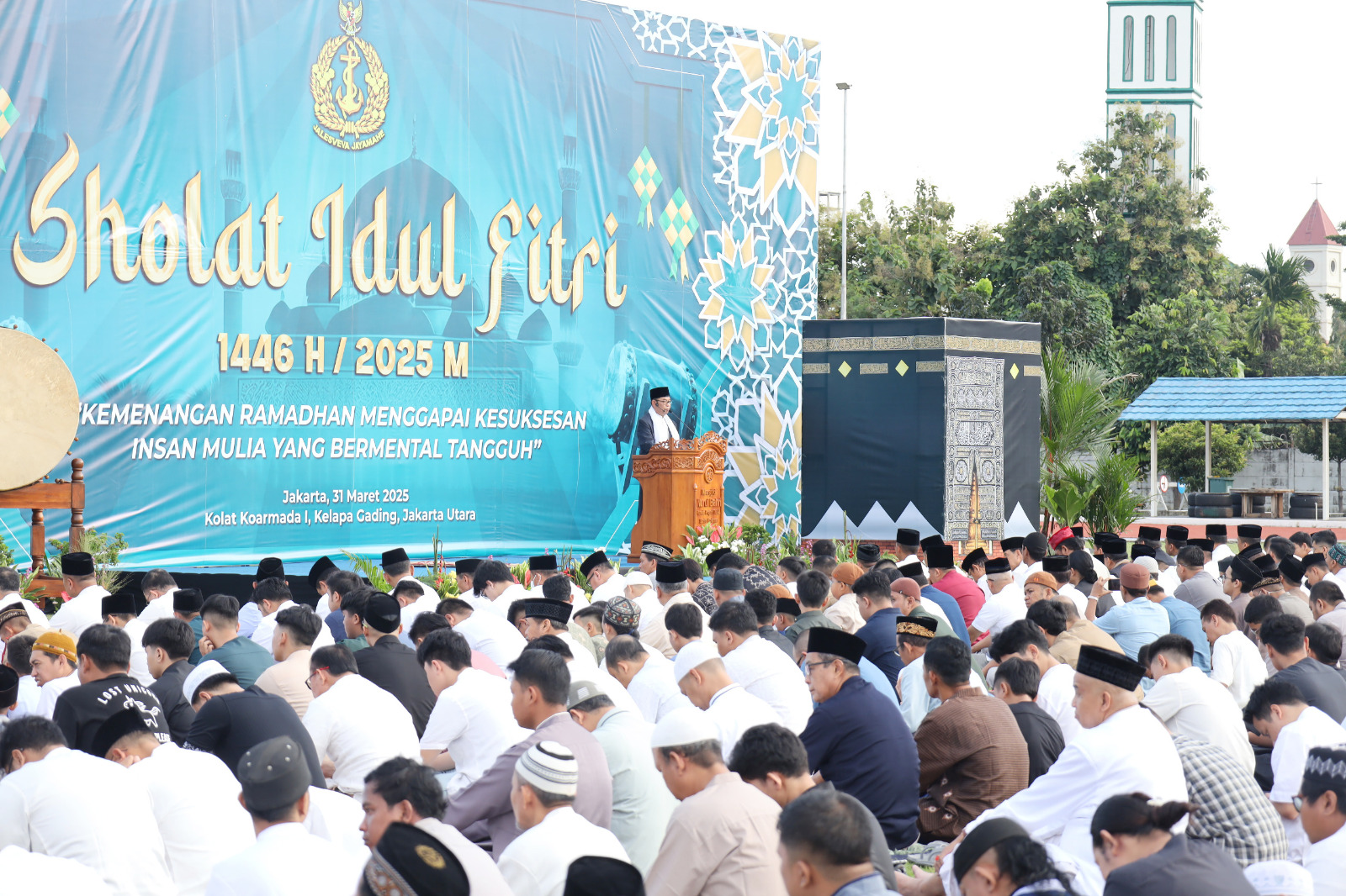 TNI AL–Dispenlantamal3. Komandan Pangkalan Utama TNI Angkatan Laut (Danlantamal) III Jakarta Brigjen TNI (Mar) Harry Indarto, S.E., M.M. dan Ketua Koordinator Cabang (Korcab) III Daerah Jalasenastri Armada (DJA) I Ny. Neneng Harry Indarto melaksanakan shalat Idul Fitri 1 Syawal 1446 H/2025 M yang dihadiri Wakil Kepala Staf Angkatan Laut (Wakasal) Laksdya TNI Erwin S. Aldedharma, S.E., M.M., M.Sc. dan Wakil Ketua Umum Jalasenastri Ny. Ketty Erwin S. Aldedharma, dengan imam sekaligus khatib shalat Idul Fitri Laksma TNI (Purn) Dr. Drs. Asep Saepudin, S.Ag., S.H., M.H., bertempat di lapangan sepak bola Kolat Koarmada I Kodamar, Jakarta Utara, Senin (31/03/2025).