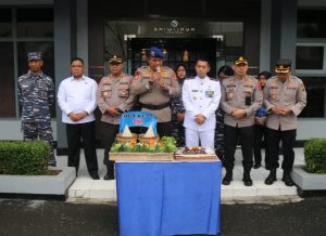 Dirpolairud Polda Sumsel Kombes Pol Drs. Andreas Kusmaedi, M.M., yang didampingi Perwira Staffnya menyambangi Mako Lanal Palembang dengan membawa kejutan berupa Tumpeng sebagai wujud turut berbahagia serta Sinergitas dalam rangka memperingati HUT TNI Ke-77 Tahun 2022, Rabu (05/10/2022).