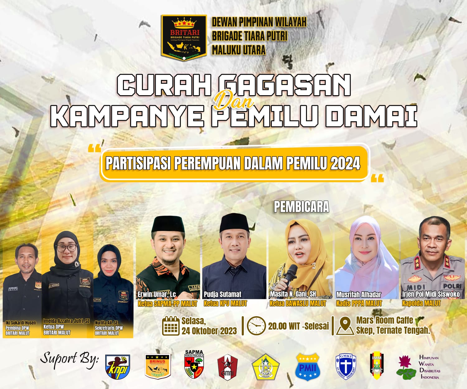 Pada kegiatan tersebut, DPW BRITARI MALUT berkolaborasi dengan Berbagai Ormas/OKP diantaranya DPD KNPI Malut, IMM Maluku Utara, GMKI , GMNI Malut, PMII, Sapma Pemuda Pancasila , Pemuda Alkhairat dan Himpunan Wanita Disabilitas Indonesia (HWDI) Maluku Utara. Sementara pembicara yang hadir pada curah gagasan itu adalah Erwin Umar Anggota DPRD Maluku Utara, Reni Banjar dari KPU Maluku Utara, Rusli Saraha dari Bawaslu Maluku Utara dan Iptu Masqun Abdukish dari Polda Maluk Utara. Curah gagasan yang di laksanakan oleh BRITARI Malut ini menuai Pujian dari ke empat Pemateri yang hadir.