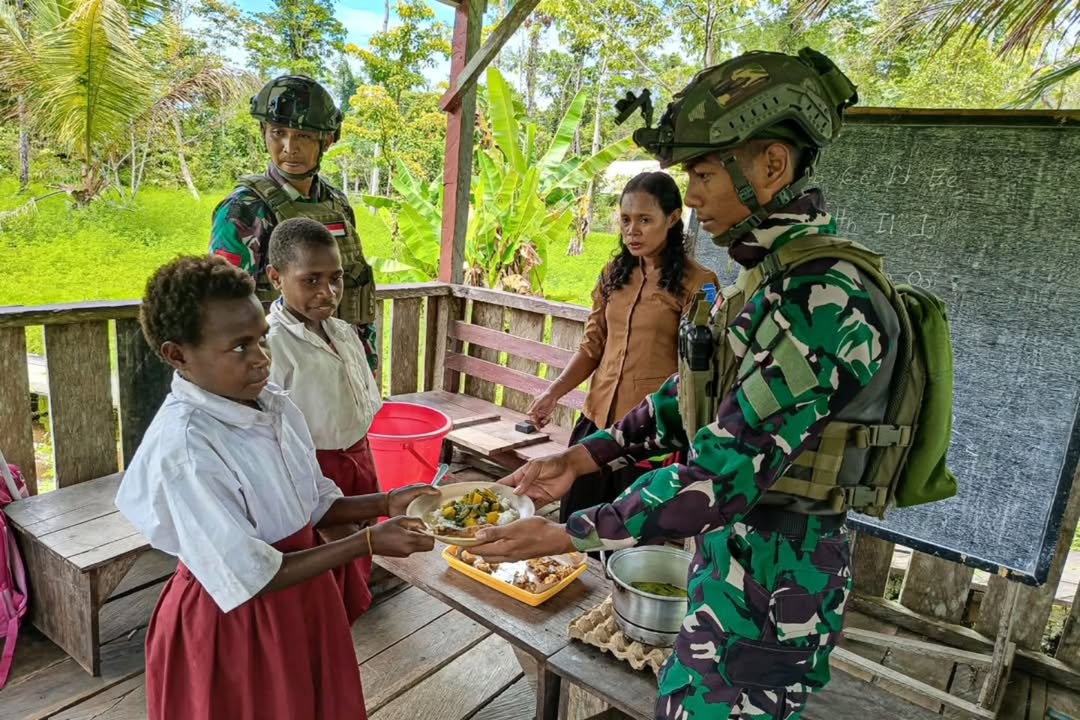 Satgas Pamtas Mobile RI-PNG Yonif 503 Kostrad gelar makan bergizi gratis untuk anak – anak di Sekolah Rimba Kampung Mumugu, Distrik Krepkuri, Kabupaten Nduga Papua Pegunungan. Selasa (21/01/2025).