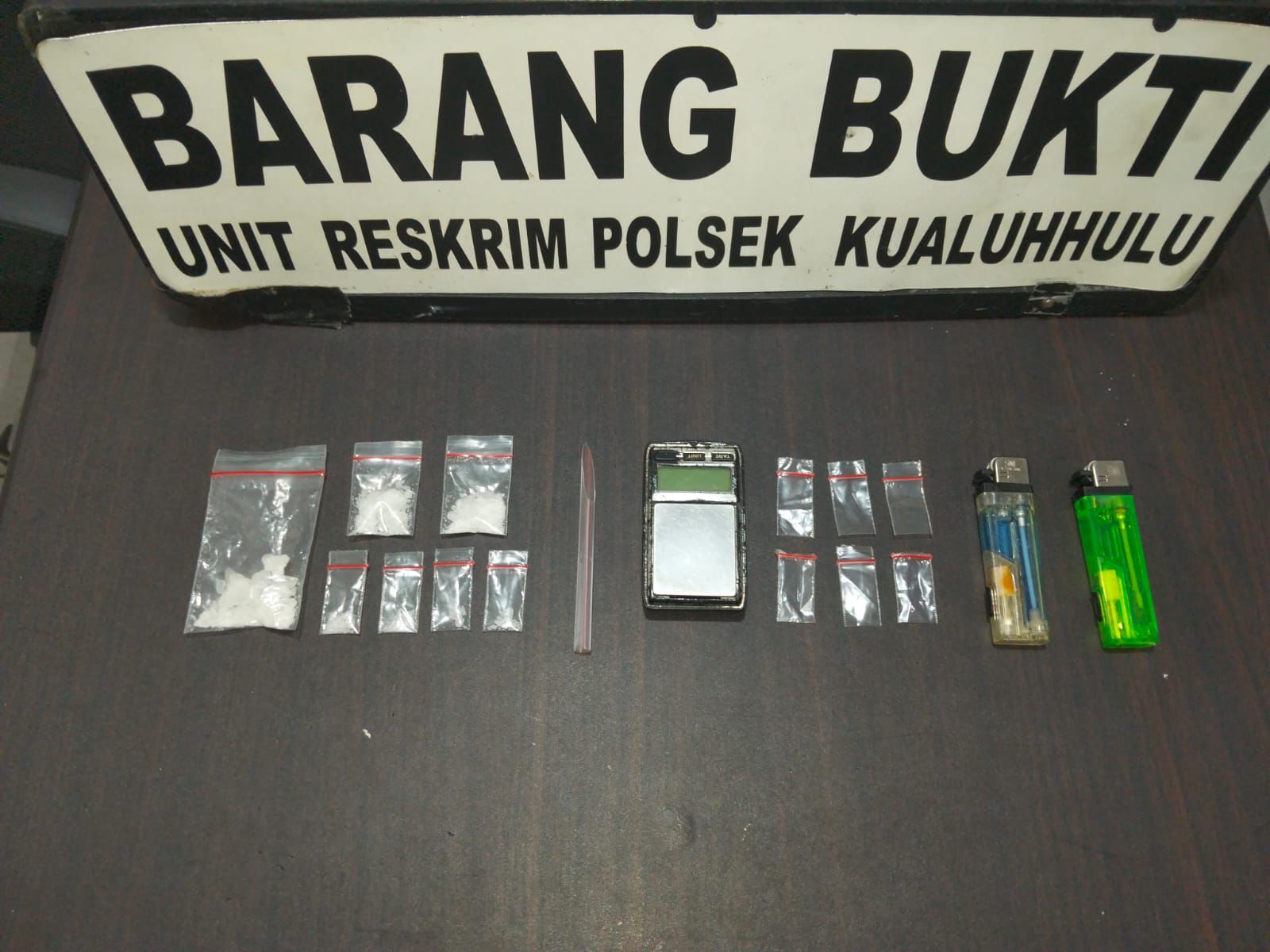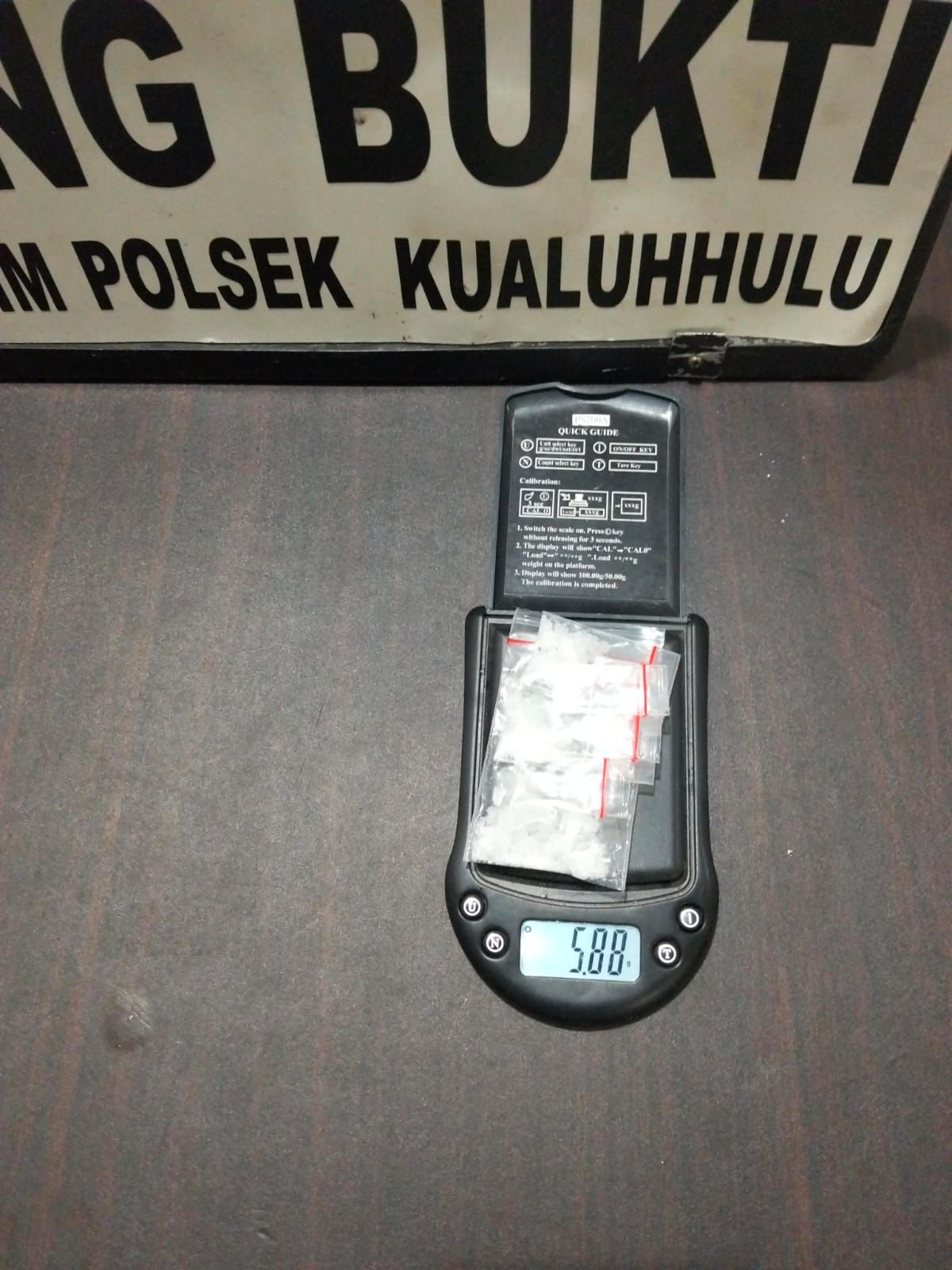 Barang bukti yang diamankan antara lain tujuh bungkus plastik klip transparan ukuran sedang berisi kristal yang diduga sabu dengan berat bruto 5,88 gram, enam plastik klip kosong, satu sekop dari pipet, satu timbangan elektrik, serta dua buah mancis.