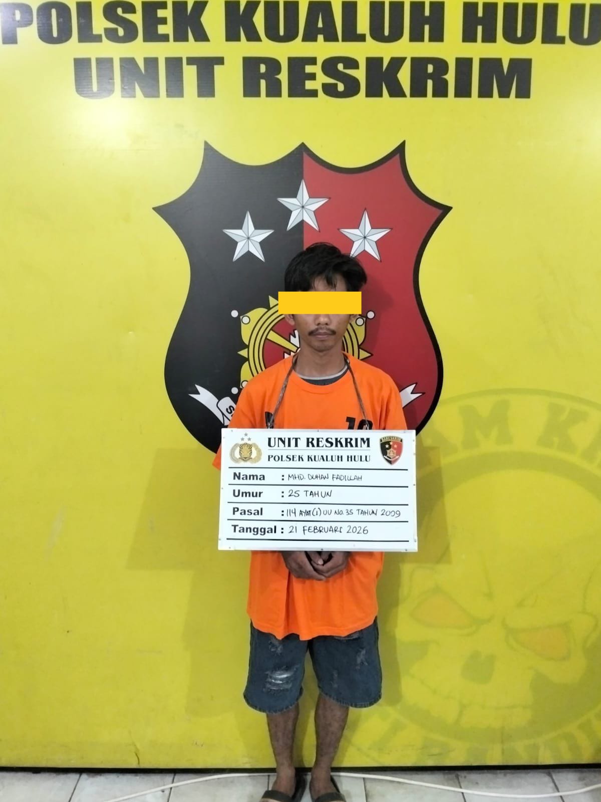 Sekitar pukul 21.30 WIB, petugas melakukan tindakan kepolisian dan mengamankan seorang laki-laki berinisial MHD Duhan Fadillah (25), warga Wonosari Lingkungan II, Kelurahan Aek Kanopan, Kecamatan Kualuh Hulu. Saat dilakukan penggeledahan di dalam kamar rumah kontrakan tersebut, petugas menemukan sejumlah barang bukti yang diduga berkaitan dengan penyalahgunaan narkotika.