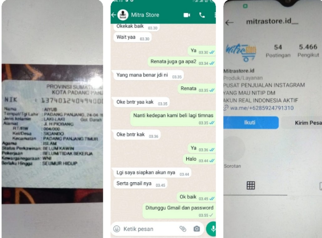 Lebih lanjut V menjelaskan penipuan penjualan akun itu adalah akun Instagram fanbase Chief Renatta Moeloek dan Timnas Sepakbola Indonesia oleh penipu atas nama sesuai KTP bernama Aiyub, kelahiran Padang Panjang 24 April 1994, jenis kelamin laki-laki, alamat di Jalan H Piobang RT 004 RW 000
