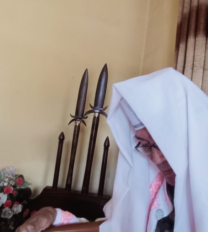 Makna tersebut juga tercermin kuat dalam visual foto yang diabadikan: sosok sepuh berselimut busana putih, menundukkan kepala dalam keheningan, berlatar simbol-simbol pusaka dan adat. Sebuah gambaran diam yang berbicara lantang tentang kearifan yang terancam terputus, sekaligus seruan sunyi agar nilai-nilai luhur bangsa kembali dijaga dan diwariskan.