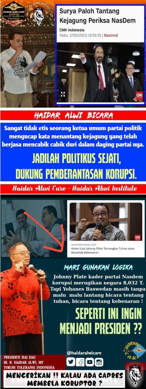 Selain itu, Presiden HAI HAC (Haidar Alwi Institute/ Haidar Alwi Care) juga geram menyikapi pernyataan salah satu Bacapres, Anies Baswedan yang berjudul, ‘Anies usai Johnny Plate Tersangka: Tuhan akan Berpihak Kebenaran’
