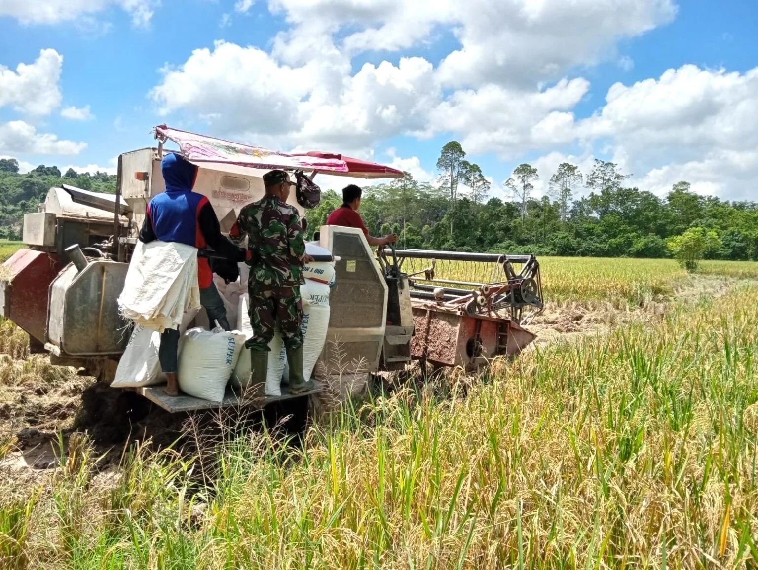 Kutai Kartanegara – Anggota Babinsa Koramil 0906-02/Loa Kulu Sertu Kasrianto bersama bapak Joni yang tergabung dalam kelompok tani Harapan Jaya lakukan panen padi yang berada di Rt 10 Desa Jembayan Tengah kecamatan Loa Kulu, Selasa 18/3/25.