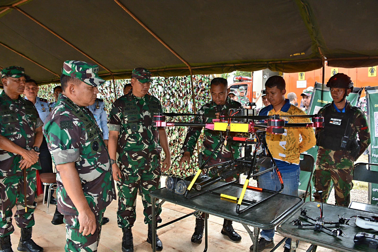 Selanjutnya Kasad menyaksikan demonstrasi Drone tembak yang dioperasikan dari jarak jauh untuk membantu pasukan yang diasumsikan mendapat kendala saat menghadapi musuh.