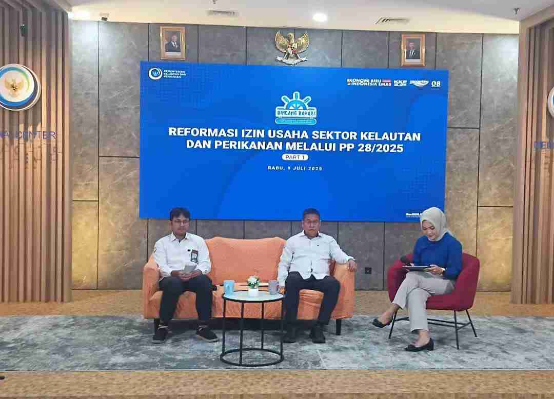 Jakarta, Kementerian Kelautan dan Perikanan (KKP) terus mendorong reformasi tata kelola perizinan di sektor kelautan dan perikanan melalui Peraturan Pemerintah (PP) Nomor 28 Tahun 2025. Sebagai upaya sosialisasi kebijakan tersebut, KKP menggelar talkshow Bincang Bahari dengan tema “Reformasi Izin Usaha Sektor Kelautan dan Perikanan melalui PP 28 Tahun 2025”, yang berlangsung di Media Center KKP, Gedung Mina Bahari IV, Jakarta, Rabu (9/7).