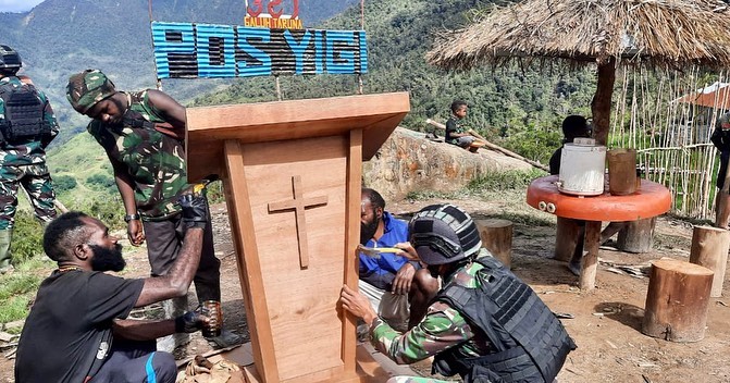 MetropolitanPost.id – Dalam rangka mendukung pelaksanaan ibadah pada saat hari perayaan natal, Satgas Yonif Raider 321/GT/13/1 Kostrad Pos Yigi buatkan mimbar yang akan digunakan untuk melengkapi sarana prasana ibadah di Gereja Karunggame yang bertempat di Distrik Yigi, Kabupaten Nduga, Papua.
