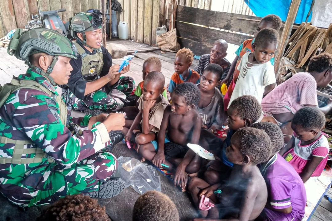 Satgas Pamtas Mobile RI-PNG Yonif 503/Mayangkara Koops Habema mengajak bermain dan melatih motorik anak – anak dengan membuat mainan kreatif pesawat kertas di Distrik Krepkuri Kabupaten Nduga Papua. Kamis (07/11/2024).