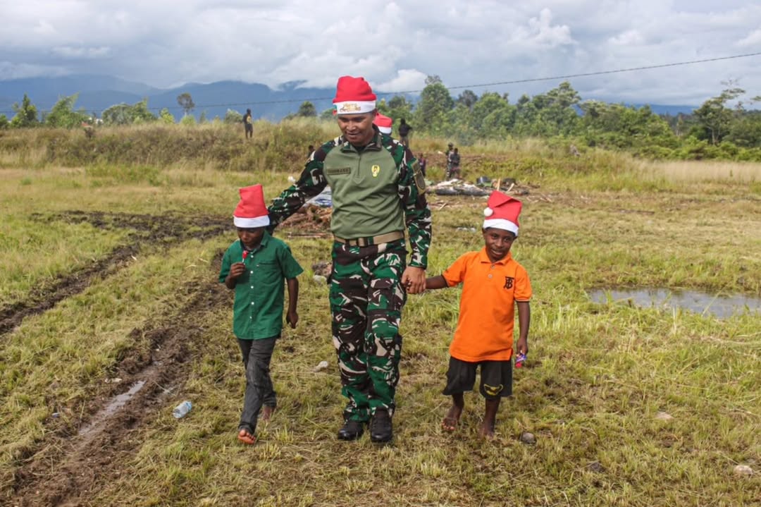 Satgas Pamtas Mobile RI-PNG Yonif 503 Kostrad bagikan topi santa dan permen kepada anak – anak sehabis melaksanakan ibadah minggu, di Gereja Kolam Betesda Distrik Kenyam Kabupaten Nduga, Papua. Minggu (15/12/2024).
