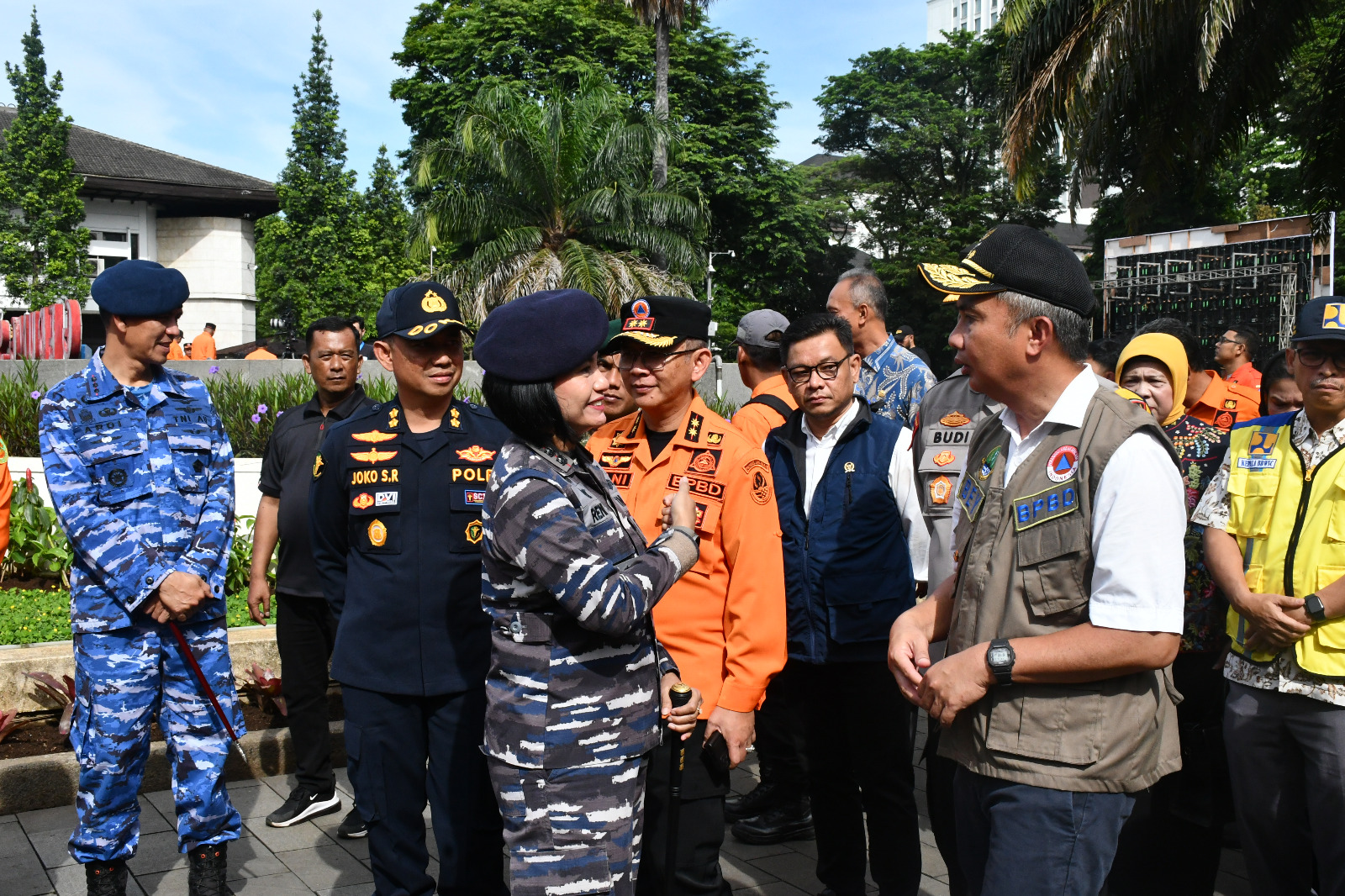 Pj. Gubernur Jawa Barat dalam sambutannya menyampaikan apresiasi yang tinggi kepada BPBD, TNI, Polri dan Relawan atas kesiapsiagaannya mengatasi bencana selama ini. Provinsi Jawa Barat adalah provinsi yang rawan bencana dan juga berdasarkan informasi dari BMKG bahwa puncak musim hujan akan terjadi pada bulan Februari hingga Maret 2024, dan juga Jawa Barat adalah provinsi dengan jumlah pemilih terbanyak yaitu 35,7 juta pemilih yang tersebar di 140.000 457 TPS, inilah yang harus kita antisipasi seandainya terjadi hujan ekstrim atau ada bencana lainnya.