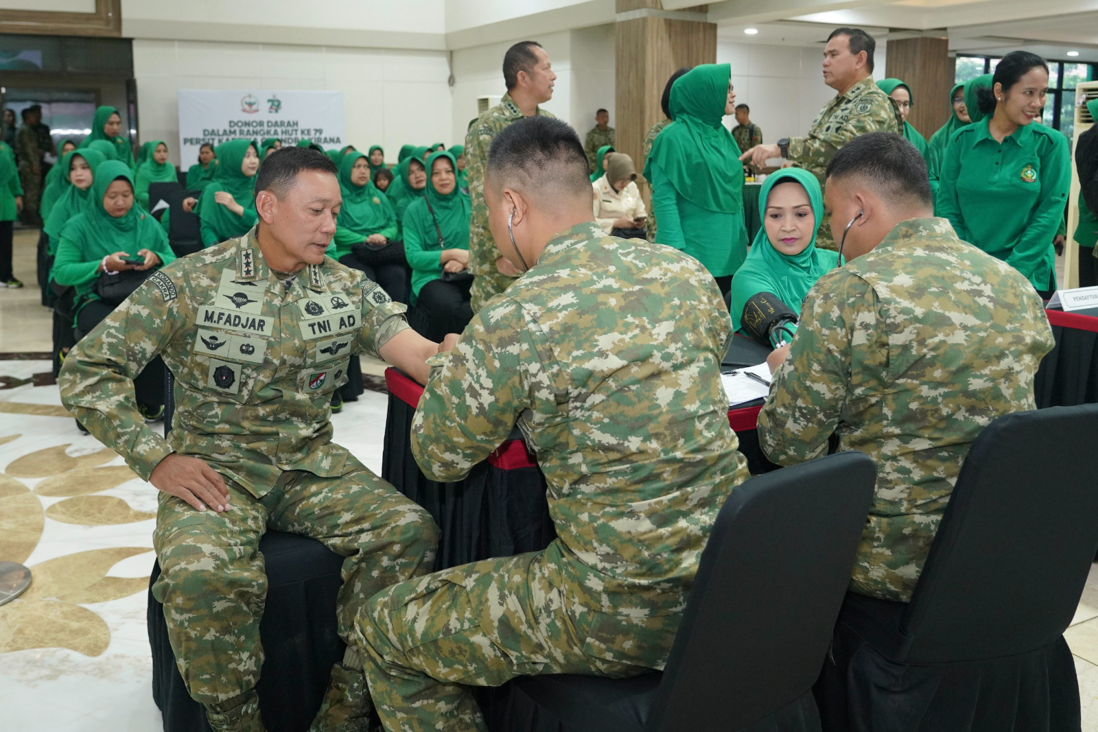 Jakarta – Panglima Kostrad (Pangkostrad) Letjen TNI Mohammad Fadjar, MPICT didampingi Ketua Persit Kartika Chandra Kirana Gabungan Kostrad, Ibu Ira Fadjar mengikuti kegiatan donor darah dalam rangka menyambut HUT Ke-64 Kostrad yang dilaksanakan di Ruang Mandala, Markas Kostrad, Gambir, Jakarta Pusat. Rabu (12/2/2025).