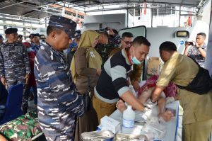Komandan Lanal Dumai Kolonel Laut (P) Stanley Lekahena, M.Tr. Hanla., didampingi Ibu Ketua Jalasenastri Cabang 4 Korcab I DJA I Ny. Sandra Stanley melaksanakan Bhakti Kesehatan (Khitanan, Donor Darah diatas KRI, Pembersihan Plak dan Karang Gigi) dalam rangka HUT TNI Angkatan Laut Tahun 2022 yang dipimpin langsung oleh Kepala Staf Angkatan Laut (Kasal) Laksamana TNI Yudo Margono dari KRI Semarang-594 di Perairan Pulau Untung Jawa dan diikuti secara virtual melalui zoom meeting dari Dermaga C Pelindo Dumai, Jalan Datuk Laksamana, Kelurahan Buluh Kasap, Kecamatan Dumai Timur, Selasa (06/09/2022).