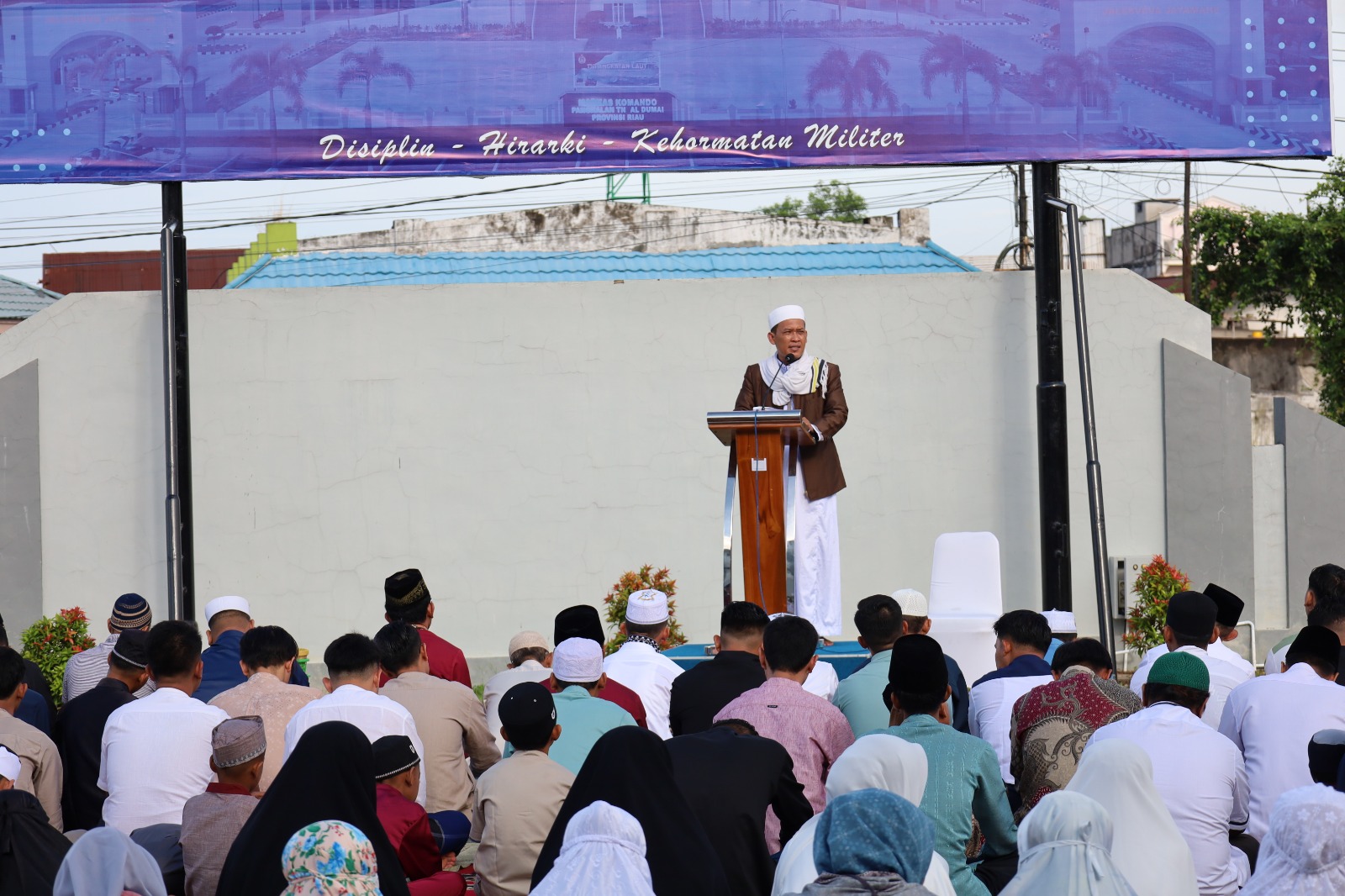 MetropolitanPost.id – Komandan Pangkalan TNI Angkatan Laut Dumai Kolonel Laut (P) Boy Yopi Hamel dan Ketua Cabang 4 Korcab I DJAI Ny. Gressy Hamel bersama Keluarga Besar Prajurit Lanal Dumai, serta masyarakat sekitar Mako Lanal Dumai melaksanakan Sholat Idul Fitri 1445 H/2024 M di Lapangan Apel Markas Komando Lanal Dumai, Jalan Yos Soedarso No. 1, Kelurahan Buluh Kasap, Kecamatan Dumai Timur, Kota Dumai, Rabu (10/04/2024).