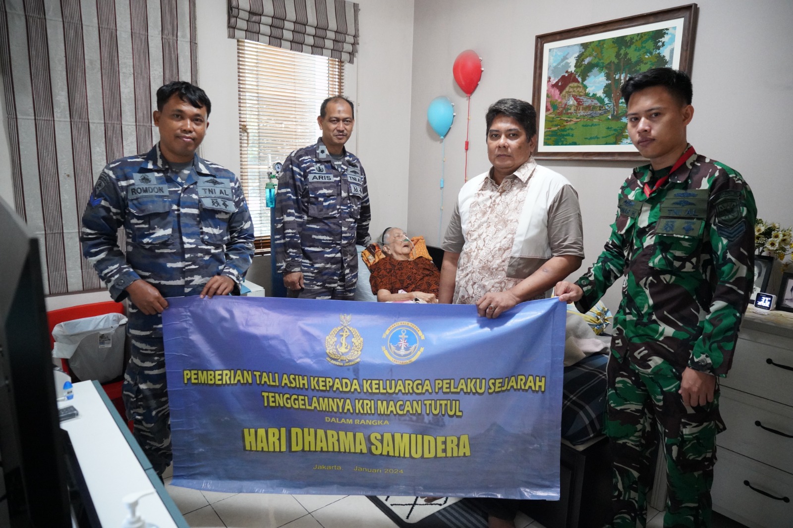 MetropolitanPost.id – Komandan Pangkalan Utama TNI Angkatan Laut (Danlantamal) III Jakarta Brigjen TNI (Mar) Harry Indarto, S.E., M.M. diwakili oleh Kasubdiswatpers Disminpers Lantamal III Jakarta Mayor Laut (T) Aris Isnawan melaksanakan anjangsana dan pemberian bantuan sosial dari Kepala Staf Angkatan Laut (Kasal) Laksamana TNI Dr. Muhammad Ali, S.E., M.M., M.Tr.Opsla. dalam rangka memperingati Hari Dharma Samudera tahun 2024 kepada Ny. Sri Rachmani istri dari Mayor Laut (Anumerta) Memet Sastrawiria ABK RI Matjan Tutul pahlawan pertempuran Laut Aru bertempat di cluster Giorgia blok TA 6 No. 16 Kota Wisata Cibubur, Bogor, Kamis (11/01/2024).
