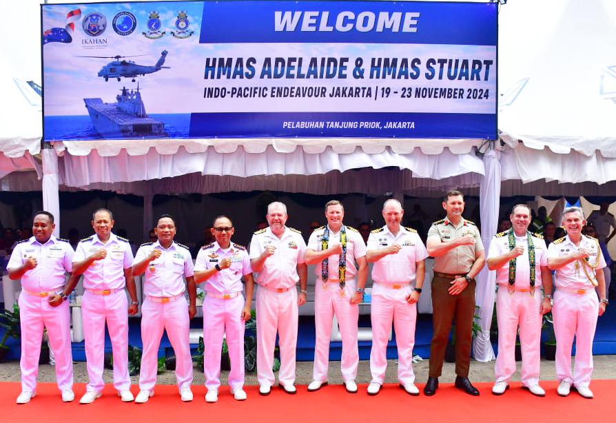 TNI AL-Dispenlantamal3. Komandan Pangkalan Utama TNI Angkatan Laut (Danlantamal) III Jakarta Brigjen TNI (Mar) Harry Indarto, S.E., M.M. diwakili oleh Wakil Komandan (Wadan Lantamal) III Jakarta Kolonel Laut (P) Whisnu Kusardianto, S.E., M.H. menyambut kedatangan Kapal Perang Angkatan Laut Australia His Majesty’s Australian Ship (HMAS) Adelaide (L01) dengan komandan Captain Troy Duggan dan HMAS Stuart (FFH 153) dengan komandan Commander Warren Bechly bertempat di dermaga 208 pelabuhan Tanjung Priok, Jakarta Utara, Selasa (19/11/2024).
