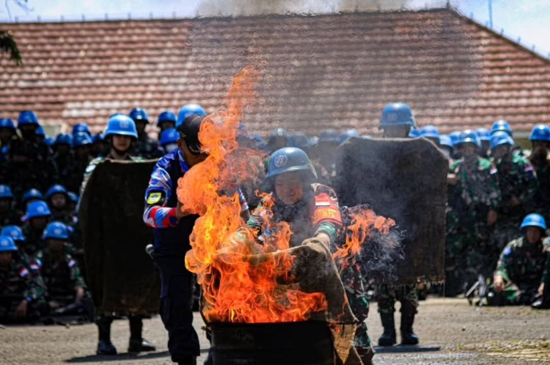Sentul — Sebagai bagian dari persiapan sebelum diberangkatkan ke daerah misi, prajurit Satgas Indo RDB XXXIX-G/MONUSCO melaksanakan latihan antisipasi dan penanggulangan bahaya kebakaran di Markas Pusat Misi Pemeliharaan Perdamaian (PMPP) TNI, Sentul, Bogor. Latihan ini merupakan salah satu materi penting dalam kegiatan Pre-Deployment Training (PDT). Jumat (30/5/ 2025).