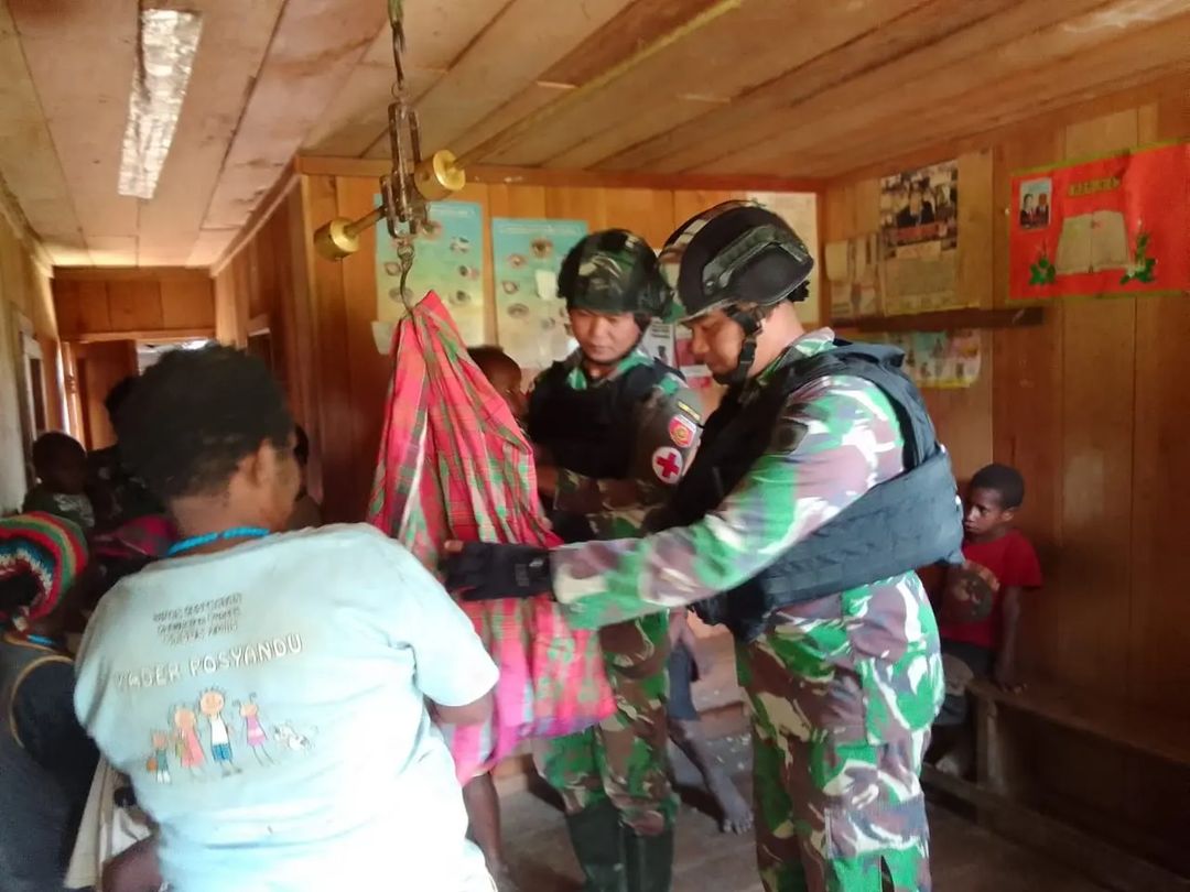 MetropolitanPost.id – Wujud kepedulian terhadap pertumbuhan dan perkembangan anak dan balita di wilayah Papua, Personil Pos Pintu Jawa Satgas Satuan Organik Yonif Raider 303 Kostrad berkerjasama dengan Puskesmas memberikan pelayanan kesehatan Posyandu di kampung perbatasan Papua tepatnya di Kampung Wombru Distrik Megeabume, Kabupaten Puncak Papua, Rabu (19/10/2022).